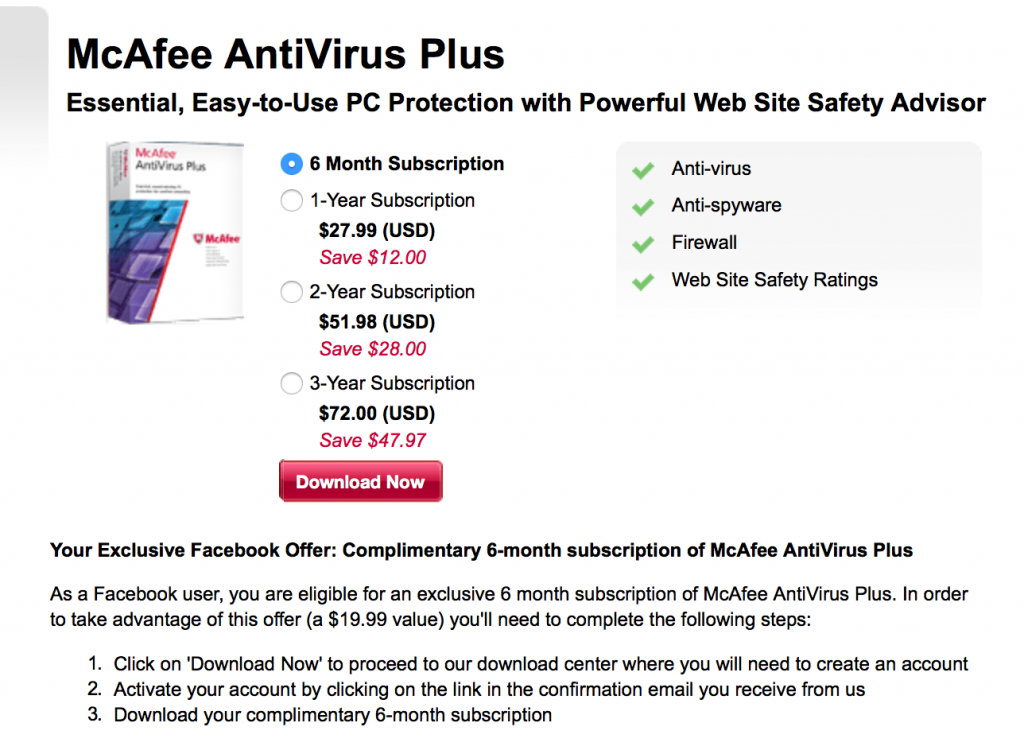 Mcafee Antivirus Free Download For Pc Full Version 2017 For a limited time only, McAfee is offering a complimentary 6-month subscription of McAfee Antivirus Plus for everyone. You are eligible for an exclusive 6 month subscription of McAfee AntiVirus Plus. In order to take advantage of this offer (a $19.99 value) you'll need to download and activate the subscription, no credit card required.