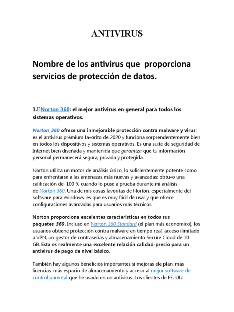 Norton Antivirus opinión (2023): Lo bueno y malo Norton es el nº 1 entre 20 antivirus. Norton es el mejor antivirus de 2023. Tiene una protección anti-malware perfecta, ningún impacto en la velocidad de su PC, todas las funciones de seguridad importantes y un precio excelente. Norton es uno de los pocos antivirus que incluye una VPN ilimitada con casi todos los productos, incluso los ...
